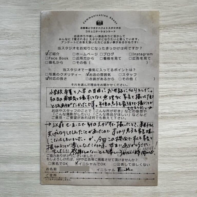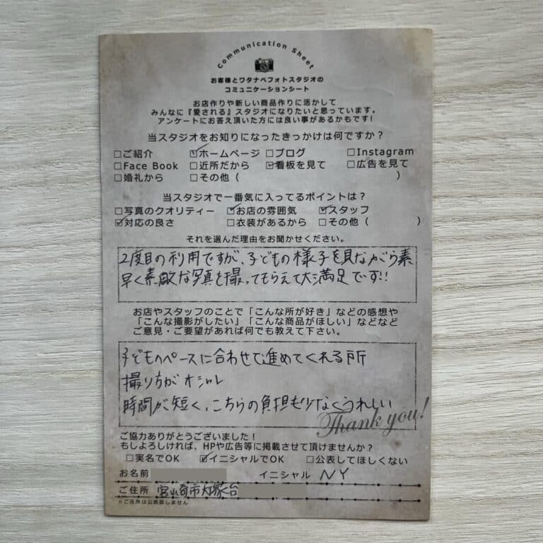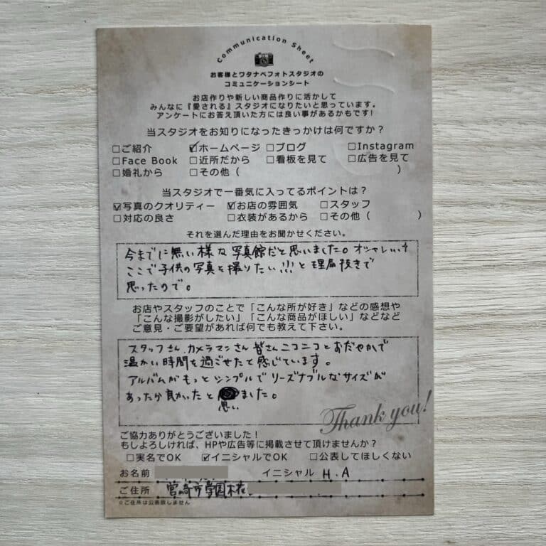 当スタジオをお知りになったきっかけは何ですか? ✔ホームページ当スタジオで一番気に入ってるポイントは? ✔写真のクオリティー  ✔お店の雰囲気それを選んだ理由をお聞かせください。今までに無い様な写真館だと思いました。オシャレ✨ここで子供の写真を撮りたい!!! と一理抜きで思ったので。ご意見・ご要望があれば何でも教えてください。スタッフさん、カ