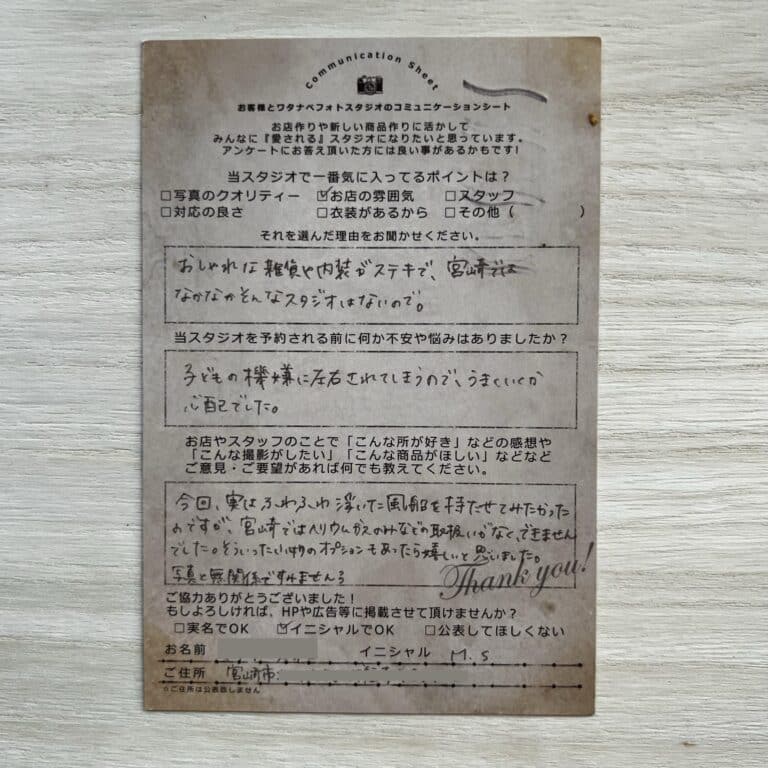 当スタジオで一番気に入ってるポイントは? ✔お店の雰囲気それを選んだ理由をお聞かせください。 おしゃれな雑貨や内装がステキで、宮崎には なかなかそんなスタジオはないので。 当スタジオを予約される前に何か不安や悩みはありましたか? 子どもの機嫌に左右されてしまうので、うまいくいか心配でした。 ご意見・ご要望があれば何でも教えてください。今回、実はふわふわ浮いた風船を持たせてみたかったの