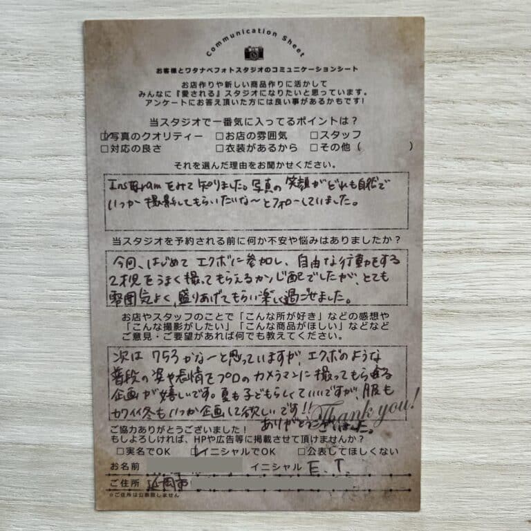 当スタジオで一番気に入ってるポイントは? ✔写真のクオリティーそれを選んだ理由をお聞かせください。 Instagramを見て知りました。写真の笑顔がどれも自然で いつか撮影してもらいたいな〜とフォローしていました。 当スタジオを予約される前に何か不安や悩みはありましたか?今回はじめてエクボに参加し、自由な行動をする2歳をうまく撮ってもらえるか心配でしたが、とても 雰囲気よく盛りあげて