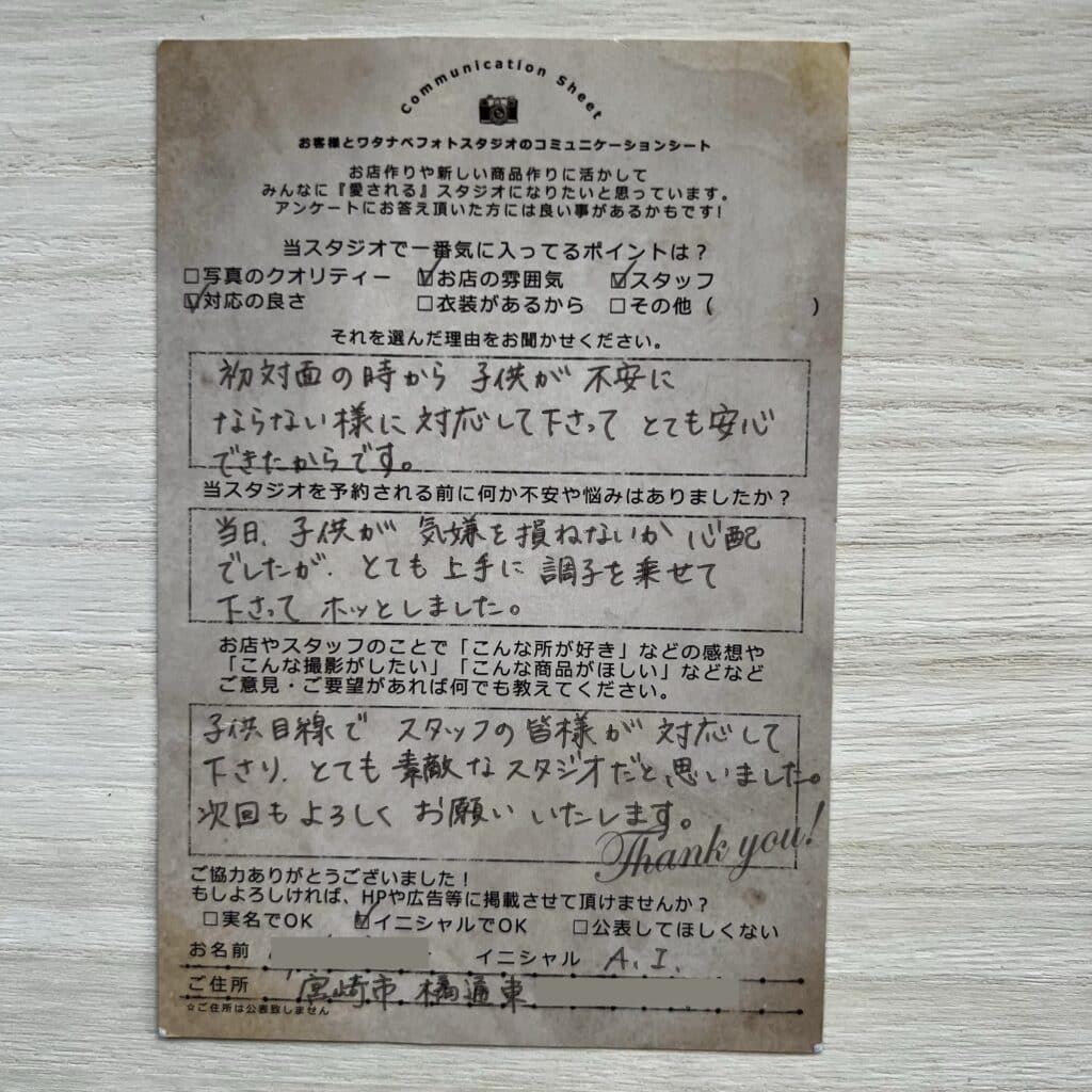 「初対面から子供さんが安心できるよう対応した」というスタッフの姿勢を評価いただけて、本当に嬉しいです。撮影前のドキドキはとても自然なお気持ちですよね。それが「ホッとした」という安心感に変わったと知り、私たちもホッとしています♪